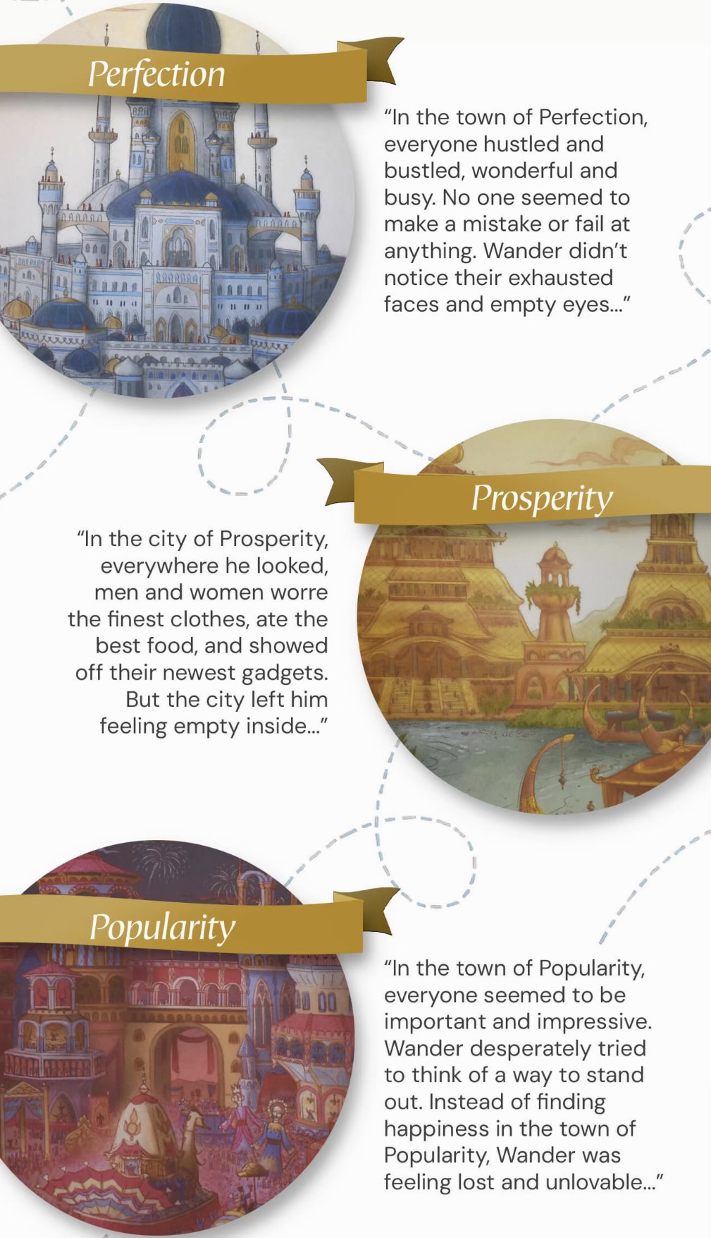 Which is why Wander finds himself traveling through the Cities of Perfection, Prosperity, and Popularity…common places we tend to search for our identity.