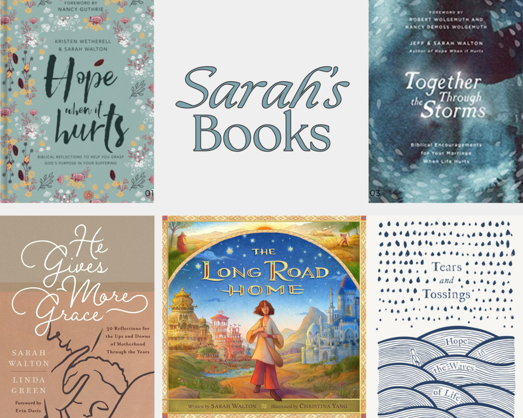 To read more of Sarah’s writings, you can purchase a copy of He Gives More Grace: 30 Reflections for the Ups and Downs of Motherhood, Hope When It Hurts: 30 Biblical Reflections to help you grasp God’s purpose in your suffering), Tears and Tossings (short evangelistic resource on how God carries our sorrows), or Together Through the Storms (for married couples navigating the trials of life). Lastly, you can now pre-order Sarah’s Pilgrim’s Progress inspired children’s book based on the account of the Prodigal Son, titled “The Long Road Home” (Crossway, October 29th, 2024).